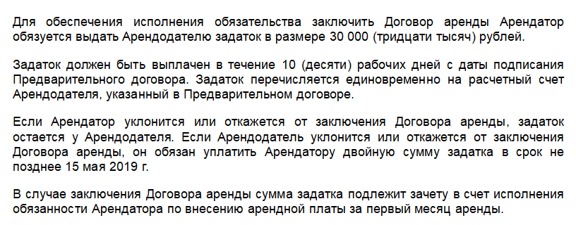Образец предварительного договора аренды с задатком (пример формулировки)