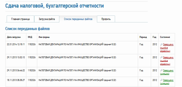 Все сданные через личный кабинет ФНС отчеты отображаются в пункте меню "Список переданных файлов":
